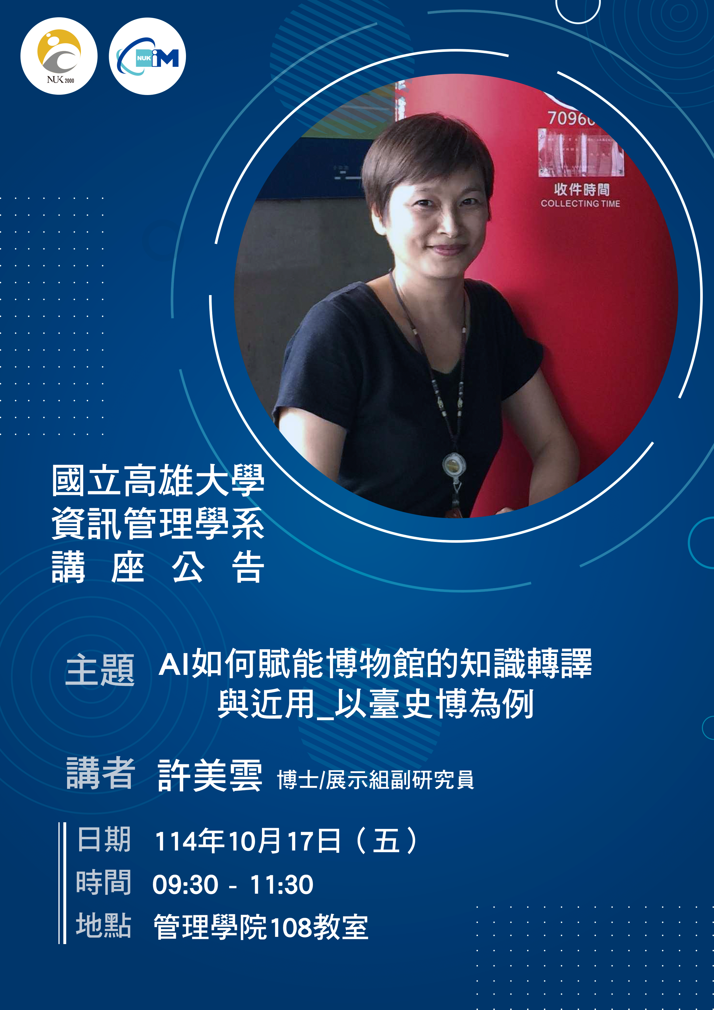 114.10.17(五)國立高雄大學資訊管理學系專題講座_許美雲博士/展示組副研究員-AI如何賦能博物館的知識轉譯與近用_以臺史博為例
