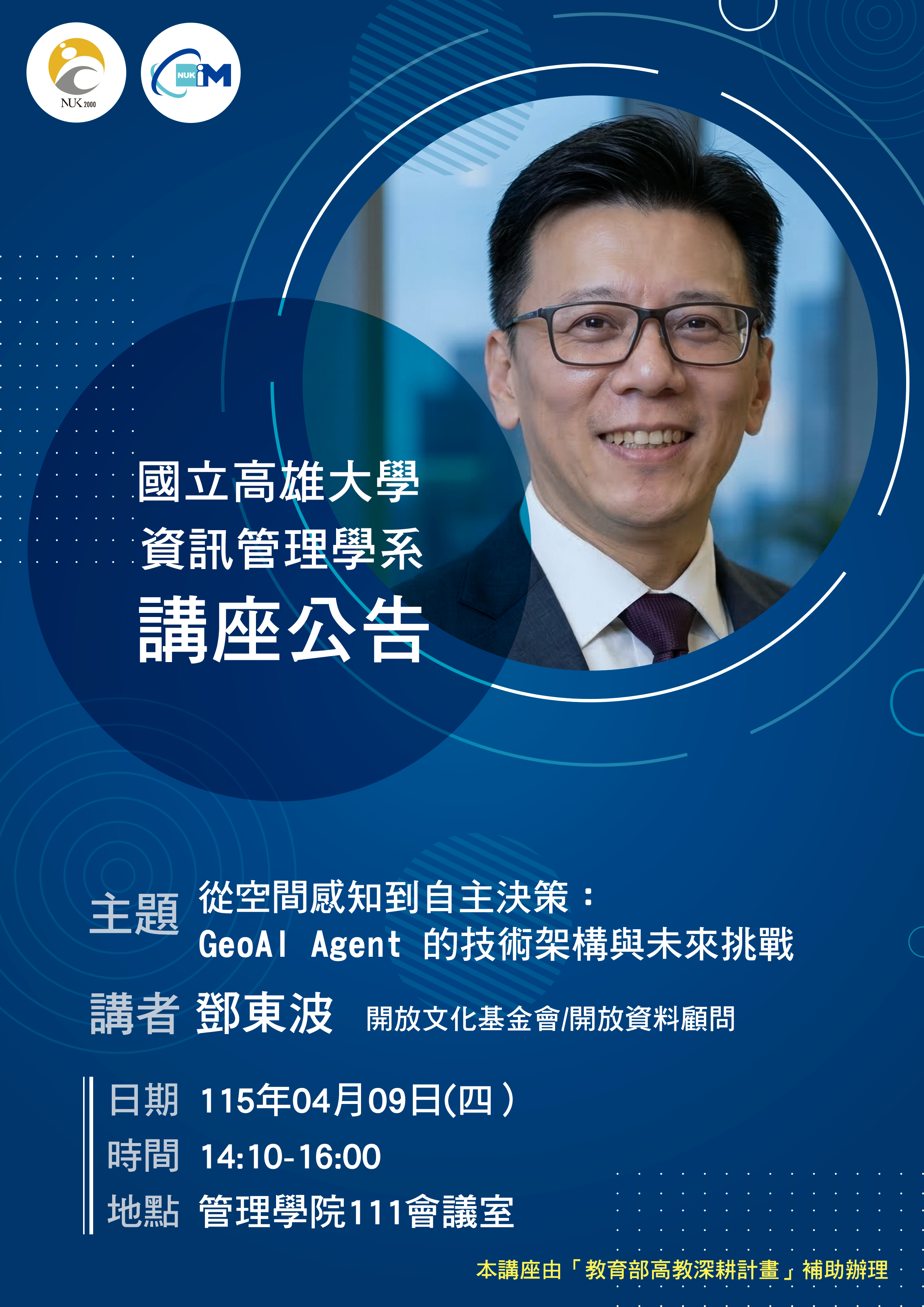 115.04.09(四)國立高雄大學資訊管理學系專題講座_鄧東波開放資料顧問-從空間感知到自主決策:GeoAI Agent 的技術架構與未來挑戰